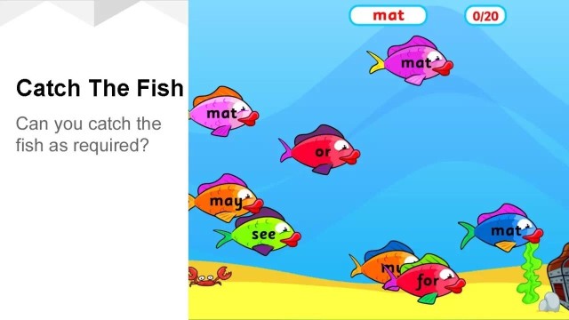 刚刚学过“mat”,所以本节的内容是让小朋友进一步加强对“mat”这个单词的记忆。总共10多只小鱼游来游去,小朋友需要抓住有“mat”这个单词的鱼哦!