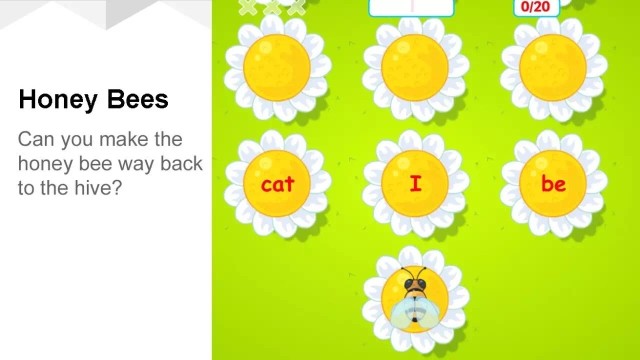 帮小蜜蜂找到回家的路吧!这是个非常简单的小游戏,目的是让小朋友认识“I”这个单词,只需让小蜜蜂依次跳到标记有“I”单词的向日葵上最终就可以回到自己的蜂巢与其它的蜜蜂团聚了!