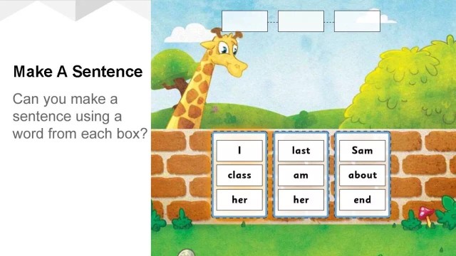 现在就让小朋友造个句子是不是有点难了?不过没关系!这个句子很简单!听听老师读这个句子,然后从方格中选出相应的单词来组成这个句子就可以完成任务了!小朋友,加油!