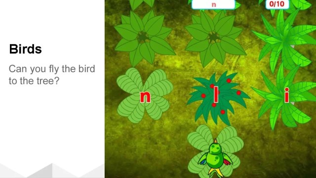 帮小鸟找到回家的路!这是个非常简单的小游戏,目的是让小朋友认识“n”这个字母,只需让小鸟依次跳到标记有“n”字母的树叶上最终就可以回到自己的家与妈妈相见了!