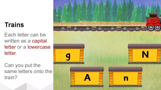 英文大写字母小写字母的识别对小朋友们来说也很重要,那么图中是不是“N”和“n”是同一个字母呢?快点把它们放到火车上运到你的小书房吧!