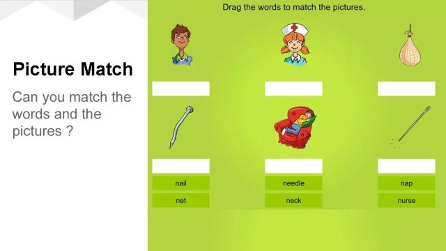要想把相应的字母和图片匹配起来,对于刚接触英语的小朋友会非常非常难!不过没有关系,通过一遍一遍的尝试,你一定可以做到的!而且有些单词我们已经比较熟悉了!