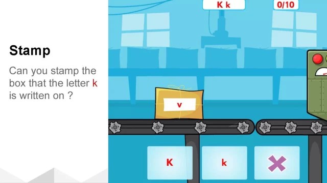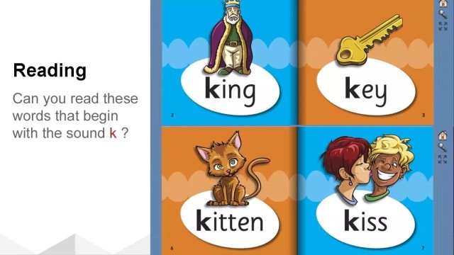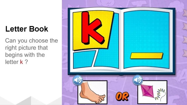 非常简单的内容,卡通老师会读出“k”的发音,然后小朋友只需要操作鼠标点击“k”就可以完成任务!