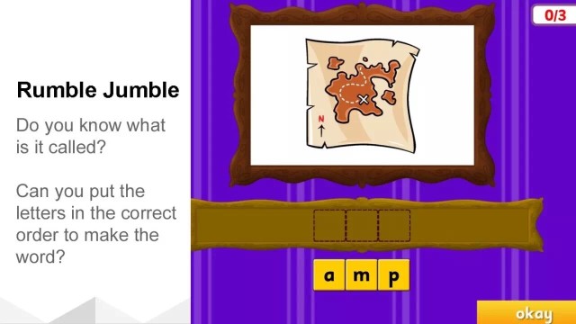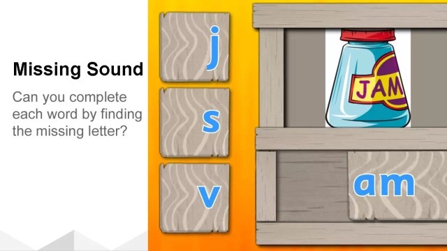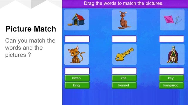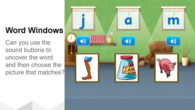当小朋友每点击一个声音按钮时,卡通老师会念出字母的声音,同时墙上的图画会打开,显示相应的字母,当全部字母显示完毕后,会出现三张图片,小朋友要选择出与单词意思对应的图片才能完成任务。是对小朋友辨音,识词能力的测试!